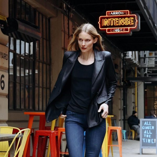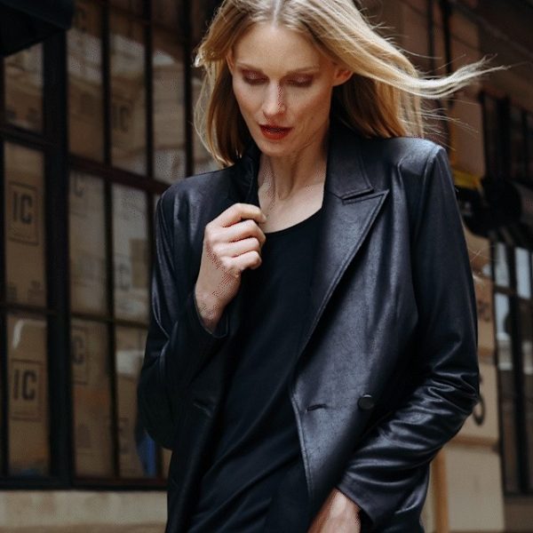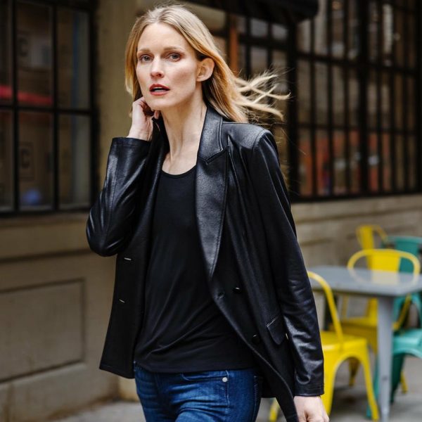 Blaze your own fashion trail in our Liquid Leather Double Breasted Blazer, which is tailored to perfection! Made from our beautiful signature stretch knit, extremely lightweight soft The model is 5’9″ wearing Extra Small (4/6)