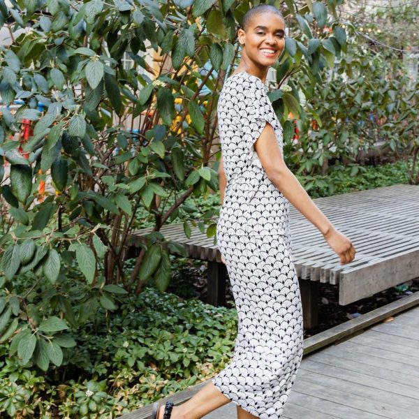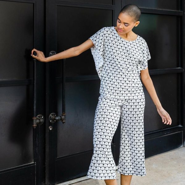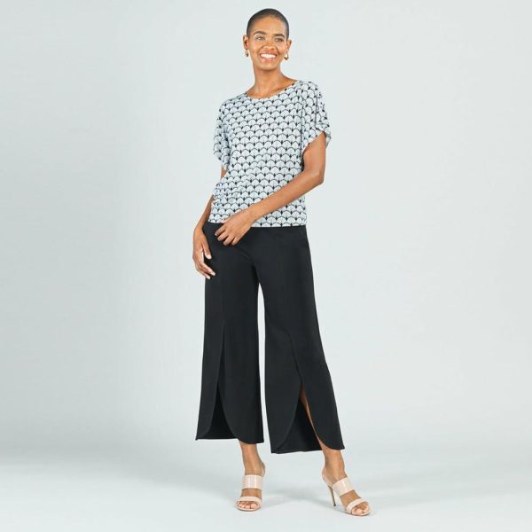 A motif of black, mini fan clusters displays a unique, flattering pattern against our buttery soft, ivory fabric.