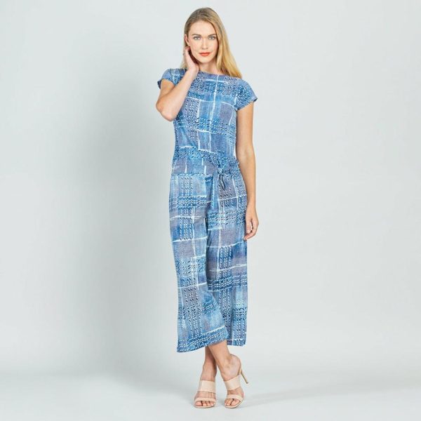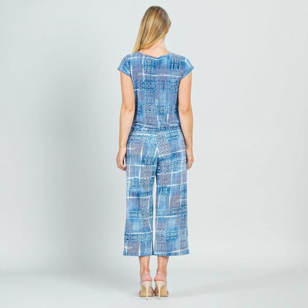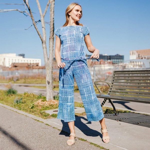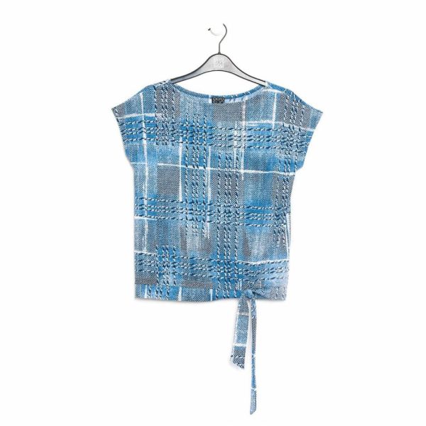 Our Denim Plaid Textured Cap Sleeve Tie Hem Top! This style features a boat neckline, cap sleeves, a boxy silhouette, and a straight-seamed hemline with tie detail.